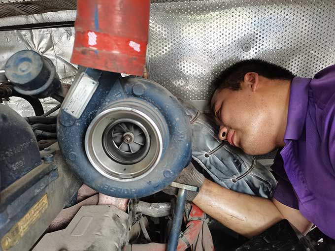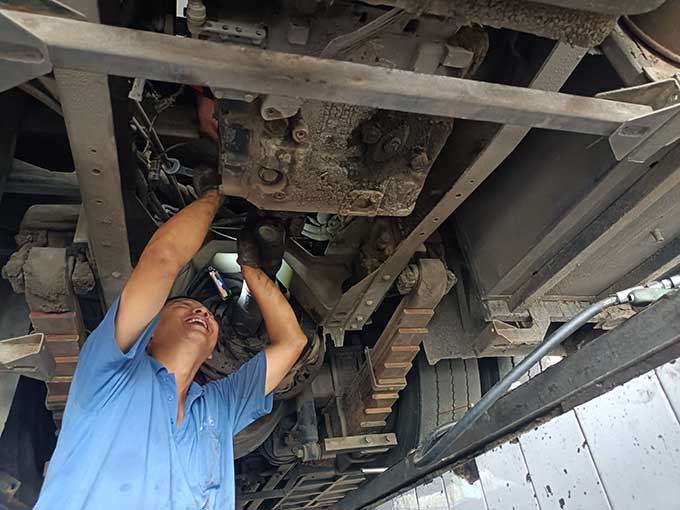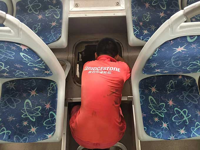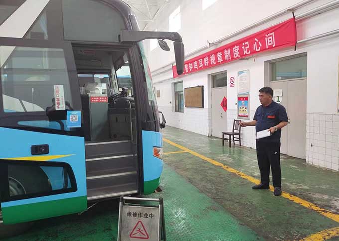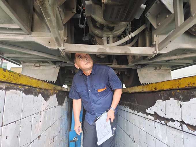 驕陽似火,汗水流淌,沾了頭發(fā),濕了臉頰,卻阻擋不了他們對工作的熱情,這是一種承諾,更是一種責(zé)任與擔(dān)當(dāng)。相比爬車頂維修空調(diào)的辛苦,鉆地溝也的滋味更不好受。不足一米深的地溝里,不僅悶熱,而且容易沾滿油垢。背靠堅硬的水泥瓷磚、頭頂公交車底盤,承受車輛部件散發(fā)的熱量,猶如鉆進烤箱。狹小的空間內(nèi),悶熱的空氣彌漫著刺鼻的機油味,底盤零部件上的塵土和油污隨著維修時的觸碰不時地落在頭上、脖子里、衣服上。為了排查故障,維修職工需要一直貓著腰、歪著頭,手上、身上滿是機油和污垢。幾分鐘的時間,豆大的汗珠就成串往下掉,工作服更是緊緊地“貼”在了身上。有時候,要檢修的部位比較靠里,在車底也無法觸及,只能從車廂里打開后座,順著幾十厘米直徑的小洞‘鉆進去’,基本上就是上半身在發(fā)動艙內(nèi),下半向在車廂內(nèi)。盡管如此,保修職工仍然憑借頑強的斗志和精益求精的工匠意識,克服重重困難,完成各項保修任務(wù)。
