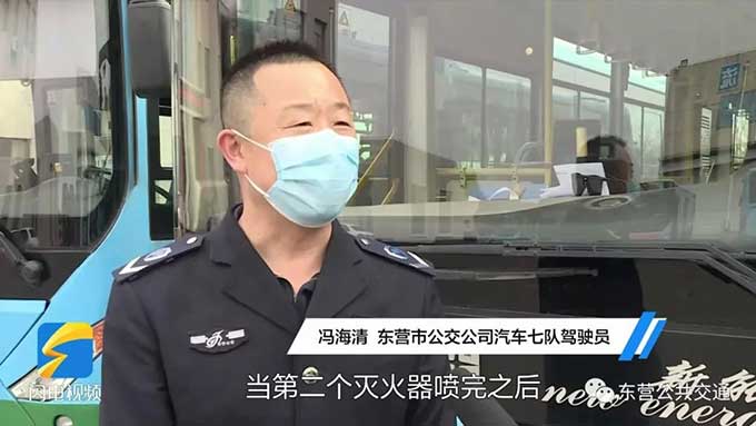 恰巧在這個(gè)時(shí)候,東營(yíng)市公交公司公交車駕駛員馮海清駕駛178路公交車行駛至東營(yíng)市一中站點(diǎn)附近,于是帶著車上的滅火器趕緊上前施救。然而噴完一罐滅火器后,煙依然很大,馮海清便趕忙回到車廂拿了兩罐,當(dāng)?shù)诙€(gè)滅火器噴完之后,火勢(shì)得到有效控制,最終在噴完第三罐滅火器后,徹底把火撲滅了。