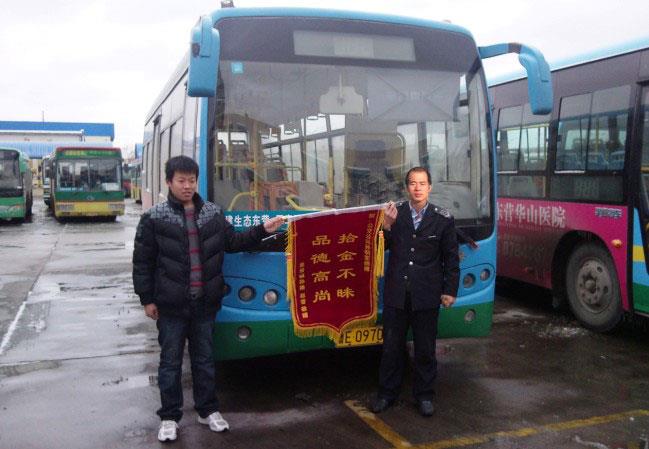 2010年12月13日上午,東營區龍居鎮麻灣村孫路、趙雪冒著紛紛揚揚的雪花來到市公交公司汽車三隊,將一面寫有“拾金不昧、品德高尚”的錦旗送到車隊領導手中,對139路駕駛員孫明軍同志表示感謝,并對公交公司培養出這么好的員工表示敬意。